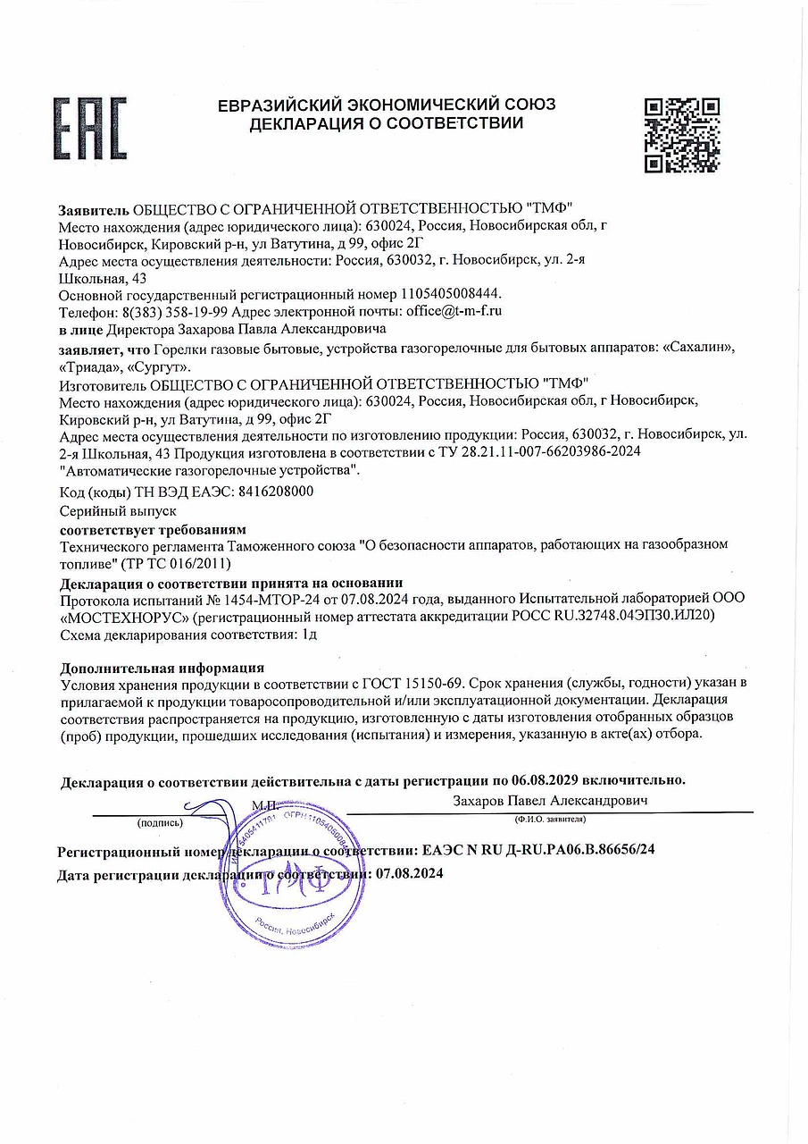 • Можно самостоятельно подобрать наиболее подходящую Вам газовую горелку. Рекомендуется использовать фирменное сертифицированное газогорелочное устройство «Сахалин» мощностью 26 кВт